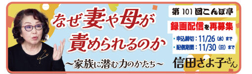 オンライン動画配信11/26まで受付再開:第101回こんぼ亭: 信田さよ子さん「なぜ妻や母が責められるのか ~家族に潜む力のかたち」