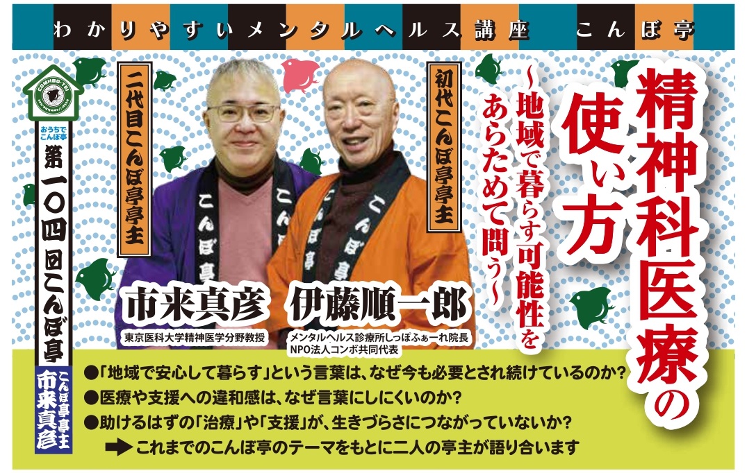 「精神科医療の使い方 ~地域で暮らす可能性をあらためて問う~ 」をテーマに、初代亭主の伊藤順一郎と二代目亭主の市来真彦が語り合います。